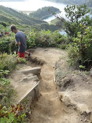 Começando pelo trilho que liga o miradouro à lagoa, verifico que há uma grande alteração no trajeto. Com efeito, há alguns anos quase não havia necessidade de escadas, pois o mesmo serpenteava aproveitando as curvas de nível. Hoje, com as escadas ter-se-á diminuído a distância, mas tornado tanto a subida, como a descida mais difíceis para quem não tenha uma boa condição física. Além disso, se se pretende oferecer qualidade a quem nos visita, o estado em que se encontram os degraus é deplorável e mesmo perigoso. Assim, alguns estão partidos e outros com desníveis muito altos e com ferros espetados, resultado da falta de manutenção e da erosão provocada pela água das chuvas que não foi devidamente desviada.